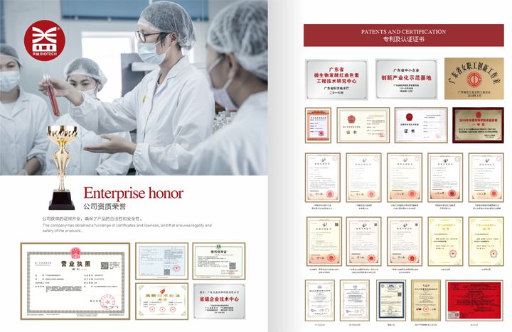 國家高新技術(shù)企業(yè)、廣東省省級企業(yè)技術(shù)中心、廣東省微生物發(fā)酵紅曲色素工程技術(shù)研究中心、等10多項和20多項發(fā)明專利,是中國食品添加劑和配料協(xié)會理事單位和中國生物發(fā)酵產(chǎn)業(yè)等協(xié)會會員單位。通過了ISO22000食品安全管理體系認(rèn)證、誠信管理體系等認(rèn)證。